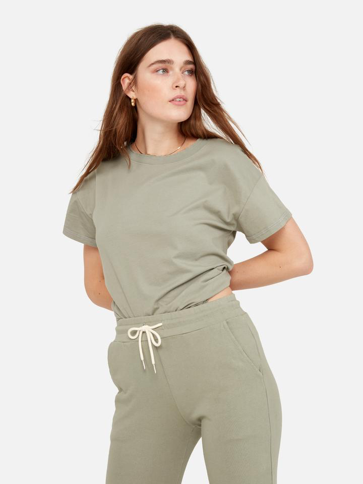 The Vintage Boxy Crew is a super relaxed fit crew tee featuring slouchy shoulders, a high/low raw edge rib neckband and 5 thread detailing.