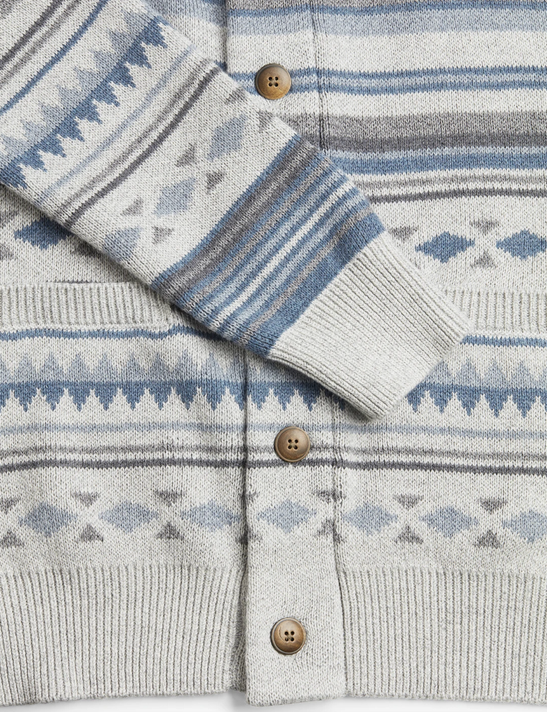 This incredible cardigan is a fall staple at Faherty, pairing everyday versatility with some serious style. It’s knit from five different colors of yarn to create the handsome, Indigenous-inspired pattern — the yarn itself is a cotton-cashmere blend for softness, warmth, and year-round breathability. Simultaneously laid-back and pulled together, this timeless piece features an easy-wearing shawl collar and real horn buttons. It’s time to get comfortable.