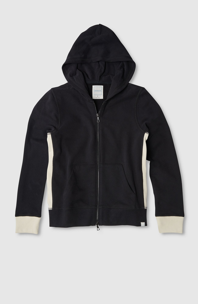Our softest French Terry gets a lift with a duel Riri zipper and colorblock side panel details.