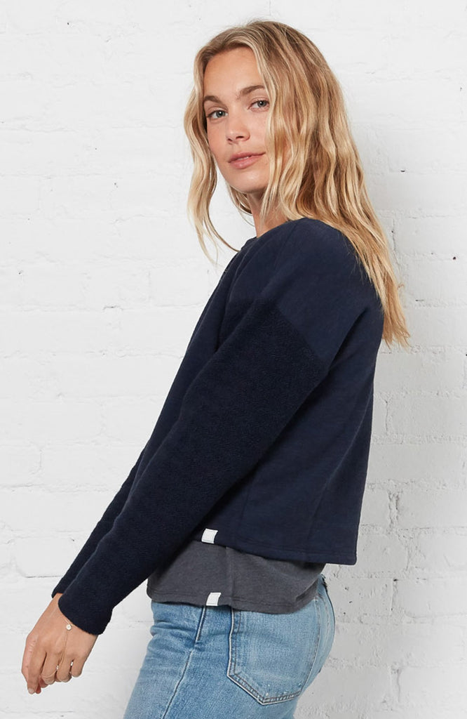 Knit from our super soft, custom blend Moulinex yarns, we’ve used the reverse side of the fabric on the sleeves for contrast style and added texture