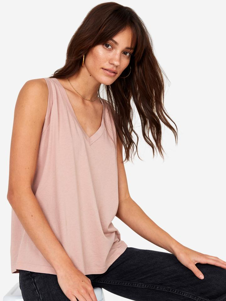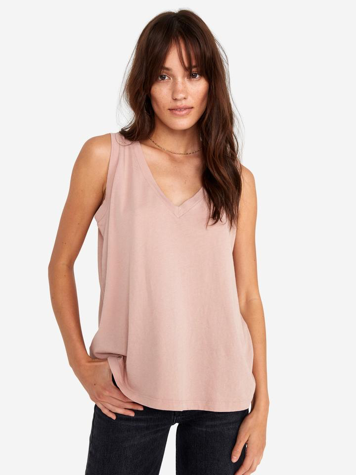 A relaxed fit v neck tank with a baseball hem is made with GOTS Organic Cotton Jersey. The V Tank has gone through a special wash to give it that worn-in hand feel.