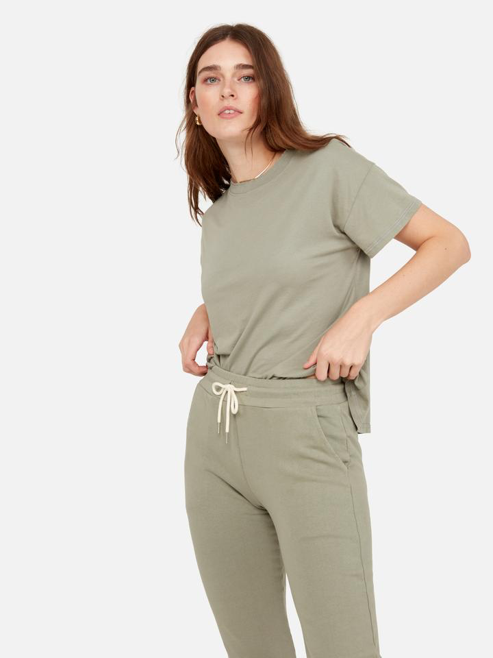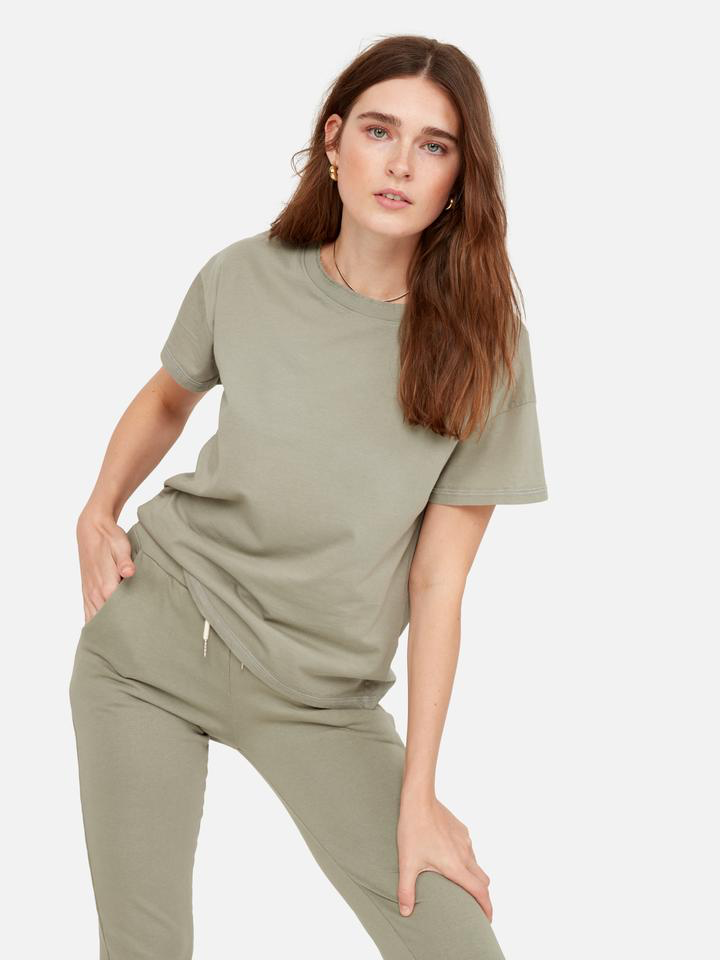 The Vintage Boxy Crew is a super relaxed fit crew tee featuring slouchy shoulders, a high/low raw edge rib neckband and 5 thread detailing.