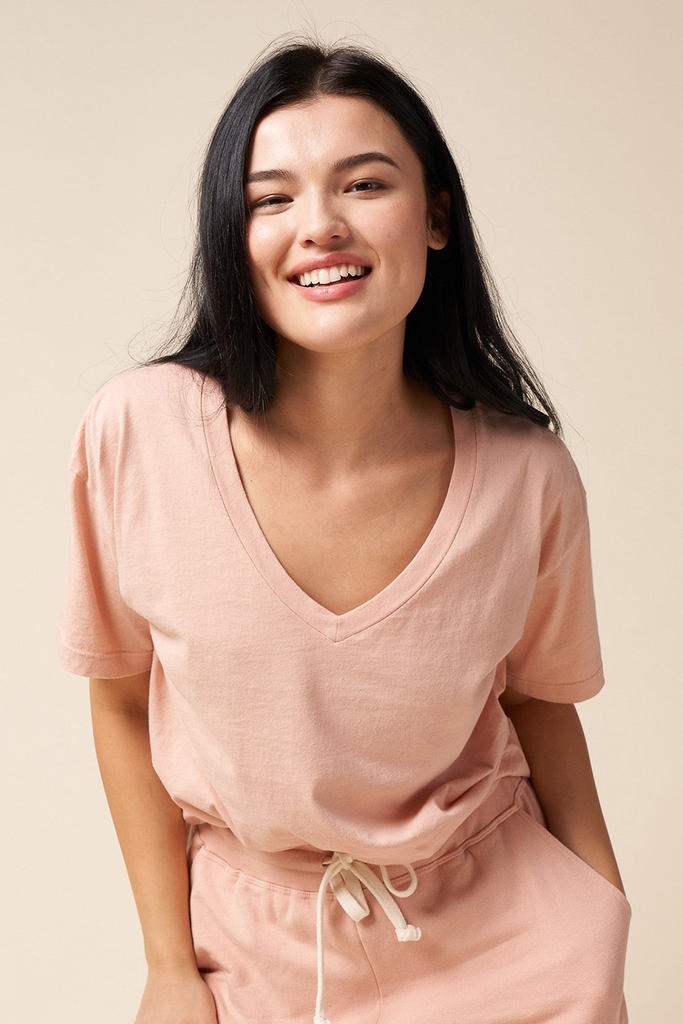 So chill. Our V neck earned its name for its laid-back shape. Its super soft fabric, made with eco-friendly dyes, gives a lived-in look that’s easy to dress up or down. Made of organic cotton and clean cutting waste, meant for a landfill, this recycled tee is as good for you as it is for the planet.